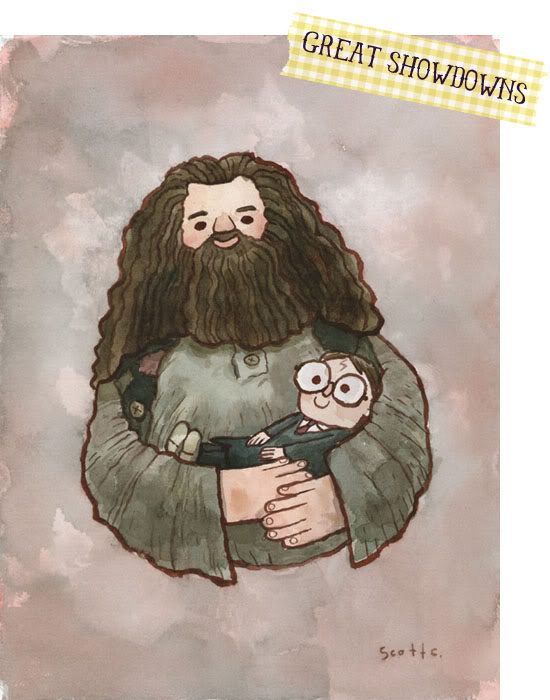O Scott C. costuma desenhar cenas famosas de filmes e fez isso com Harry Potter. O resultado é esse Harryzim no colo do meio-gigante Hagrid e está no great showdowns.