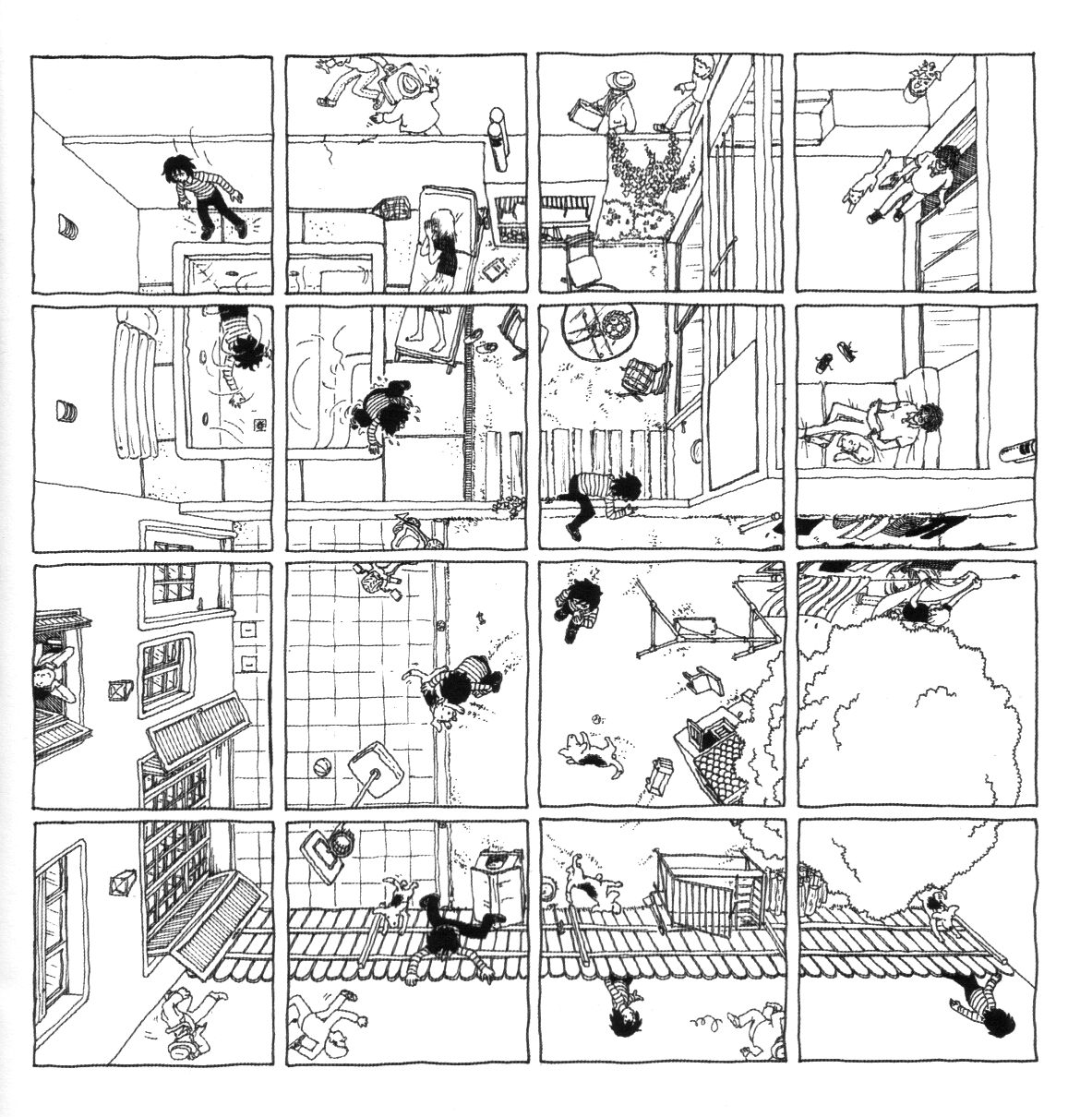 Uma coisa fácil de notar nos desenhos de Maco é o incrível uso do espaço. É possível em uma página entrar por labirintos, sair deles, acompanhar múltiplos personagens, estruturar, desestruturar e reestruturar toda a narrativa. As múltiplas possibilidades de leitura são uma graça especial deste livro.